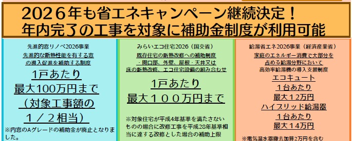 ●2025年までの超大型補助金制度を継続する形で、2026年も省エネキャンペーンが継続されました。3月に事務局が開設されて、申請できる様になるまではもうしばらく時間がかかると予想されています。