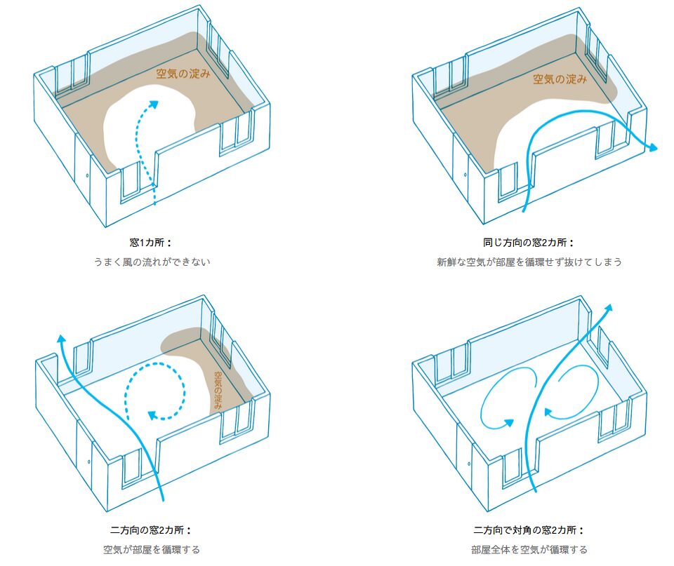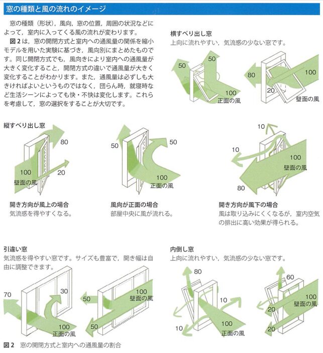 「窓の種類」にも意味があって、一番は通風です。窓種によって取り込める風の方向や量が違います。
