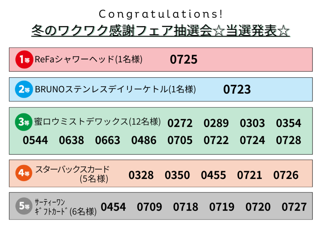 冬のワクワク感謝フェア抽選会☆当選発表☆