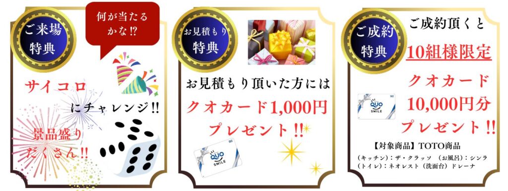 今回、ご来場特典・お見積もり特典・ご成約特典と素敵な特典をご用意しております!!