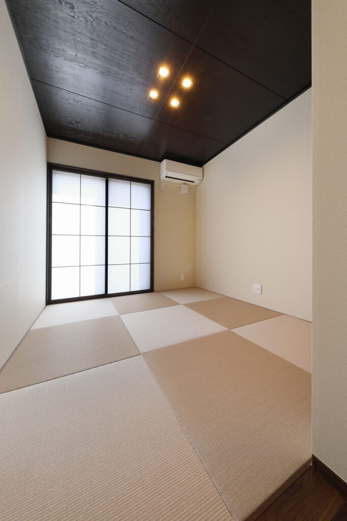 切妻屋根ですっきりと上品な外観。親世帯、⼦世帯ともにタタミで寛ぐ⽣活スタイルだからタタミに馴染む“ほどよくモダン”なインテリアに仕上げました。充実したサニタリーや収納、こだわりの造作家具まで統一感のある空間デザインで高級感あふれるお住まいです。
