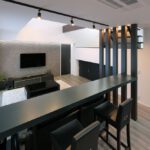 母屋の敷地内に別棟で子世帯の家を新築しました。ダークカラーとホワイトを基調としたシンプルでスタイリッシュな内装が印象的なお住まいです。スキップフロアやバーカウンターなど遊びを織り交ぜながらも落ち着きのあるシックな空間に仕上がっています。